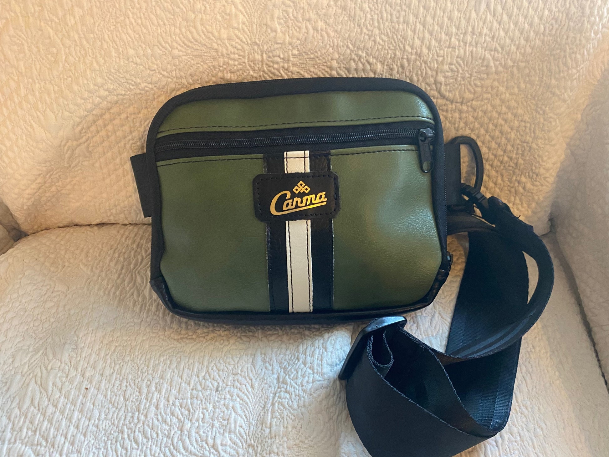 The Speedster Collection is a sporty crossbody bag as unique as you. Show your passion for car racing with this distinctive bag made of upcycled, automotive trim remnants. Salvaged seatbelt strapping fits over your shoulder or across your chest to keep your bag sleekly against your body. Carma adds the sporty touch of a racing stripe on the front.