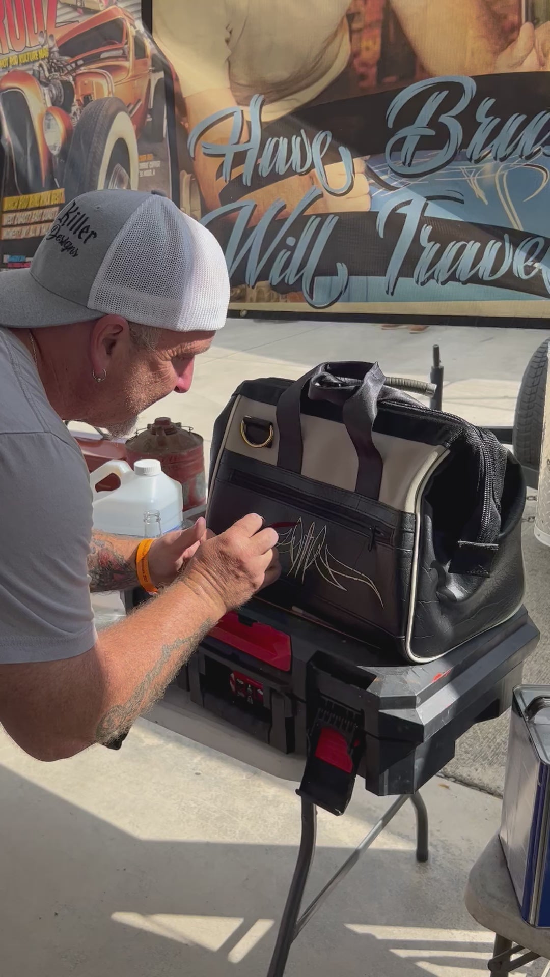 One-of-a-kind. After watching Darin Allen pinstripe cars all day at the show, we had an idea. Would he pInstripe our bag and be creative? He said, yes. So, he pinstriped this Fastback Collection bag in Light Granite with the red interior. It is killer! Now, the bag has racing stripes.