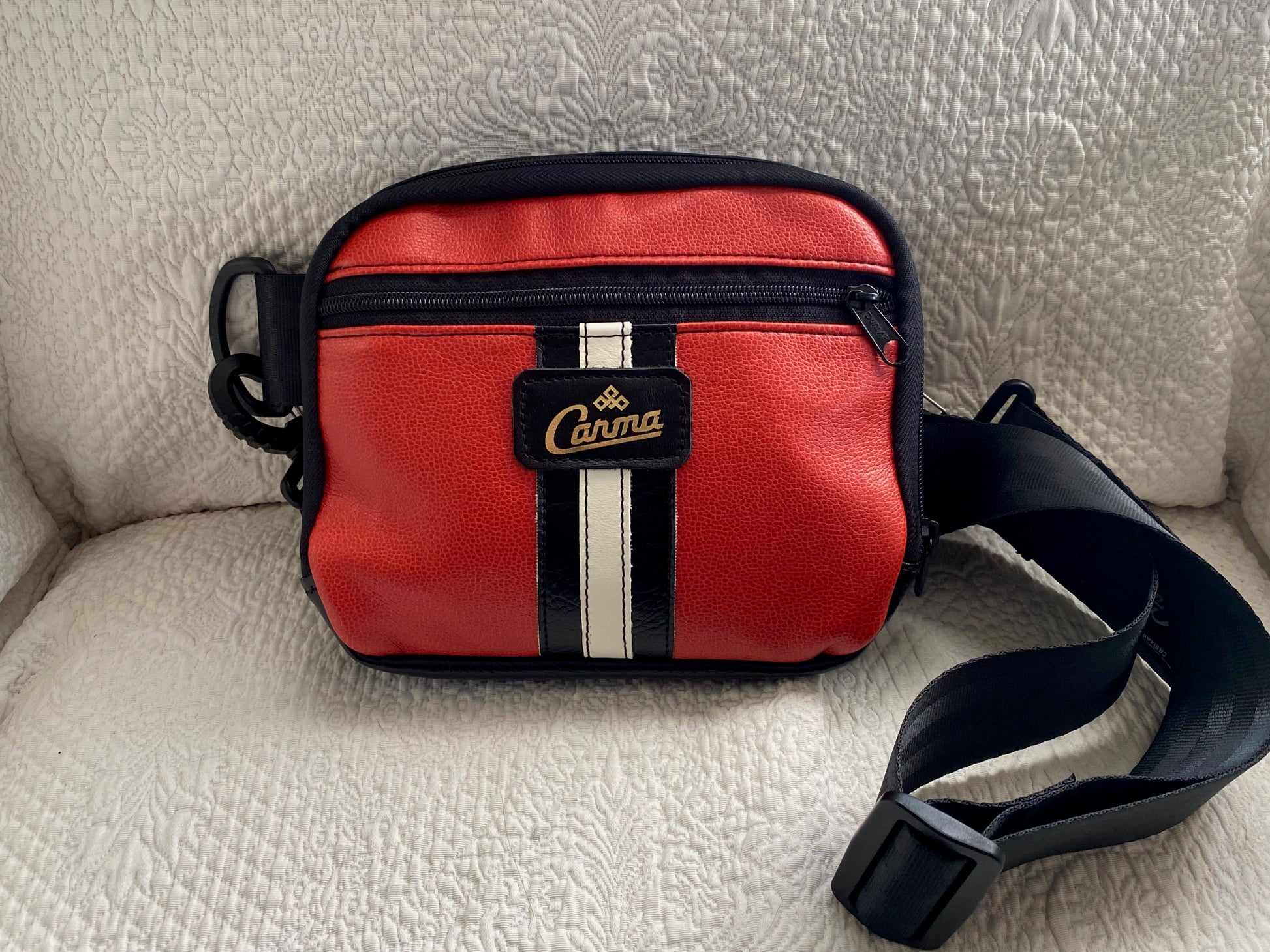The Speedster Collection is a sporty crossbody bag as unique as you. Show your passion for car racing with this distinctive bag made of upcycled, automotive trim remnants. Salvaged seatbelt strapping fits over your shoulder or across your chest to keep your bag sleekly against your body. Carma adds the sporty touch of a racing stripe on the front.