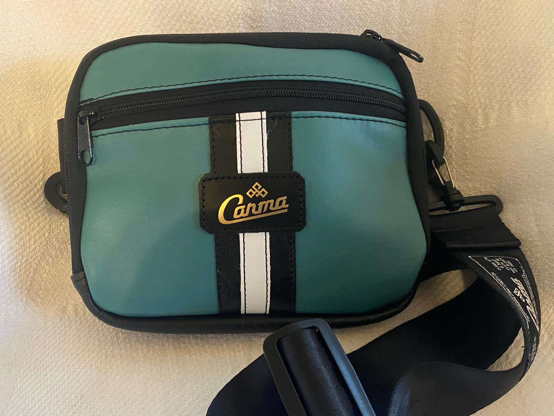 The Speedster Collection is a sporty crossbody bag as unique as you. Show your passion for car racing with this distinctive bag made of upcycled, automotive trim remnants. Salvaged seatbelt strapping fits over your shoulder or across your chest to keep your bag sleekly against your body. Carma adds the sporty touch of a racing stripe on the front.